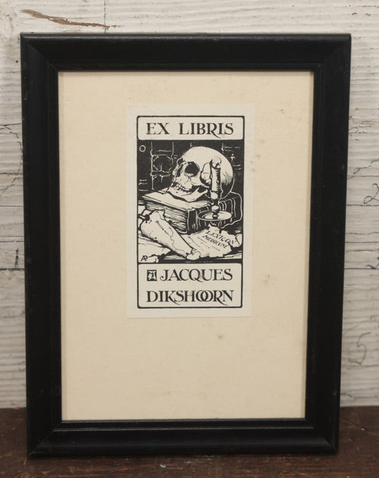 × CLOSESold outLot 048 - Vintage Framed Ex Libris Bookplate With Skull, Jacques Dikshoorn, Illustrated By Anton Franciscus Pieck