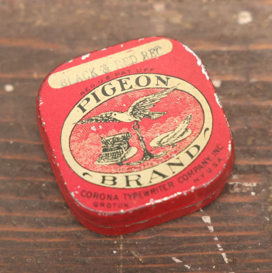 × CLOSESold outLot 053 - Antique Tin Lithograph Pigeon Brand Typewriter Ribbon Tin, By Corona Typewriter Company, Black And Red Ink, Empty