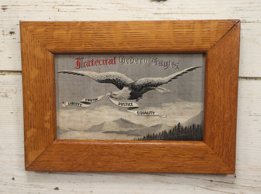 × CLOSESold outLot 055 - Antique Fraternal Order Of Eagles Embroidered Textile In Frame, Liberty, Truth, Justice, Equality, 12-3/8" x 8-3/4"