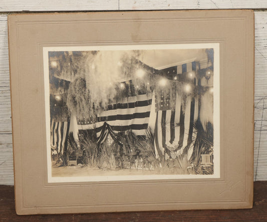 Lot 062 - Antique Boarded Photograph Of American Flags, Bunting, Palms, Unknown Location