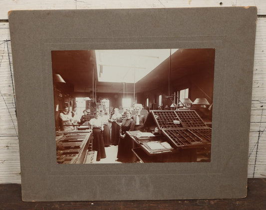 × CLOSESold outLot 066 - Antique Boarded Occupational Photograph Of A Print Shop Office, With Women And Men At Work, Type Trays