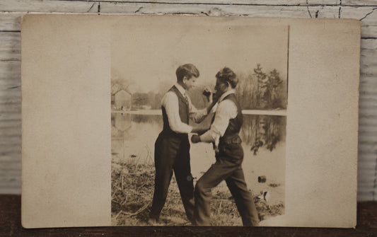 × CLOSESold outLot 079 - Antique Real Photo Postcard R.P.P.C. Of Two Young Men Play Bare Knuckle Boxing, Fisticuffs
