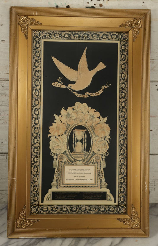 × CLOSESold outLot 005 - Antique Mourning Lithograph In Frame With Dove And Hourglass, "Gone But Not Forgotten," Copyright T.W. Campbell, 1892, Updated In Memory Of David H. Jones, Died 1996, 19-3/8" x 27-1/4"
