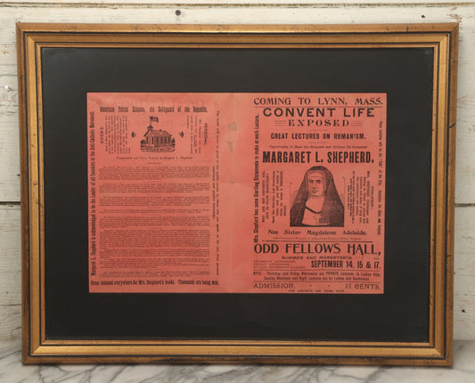 × CLOSESold outLot 006 - Antique Framed Program For "Convent Life Exposed" Event In Lynn, Massachusetts, Featuring Margaret L. Shepherd, Fraudulent Anti-Catholic Nun, Circa 1885, In Double Windowed Frame, 24-3/4" x 19-1/2"