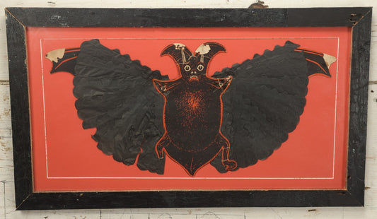 × CLOSESold outLot 009 - Vintage Embossed Paper And Crepe Halloween Bat Decoration In Custom Frame, Made In U.S.A., Note Wear, Losses, 24-7/8" x 14-1/4"