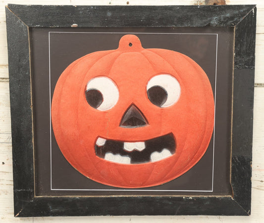 × CLOSESold outLot 015 - Antique Halloween Pumpkin Jack-O-Lantern J.O.L. By H.E. Luhrs Embossed Cardboard Paper Halloween Decoration, Made In U.S.A., In Custom Frame, 17-1/4" x 14-3/8"