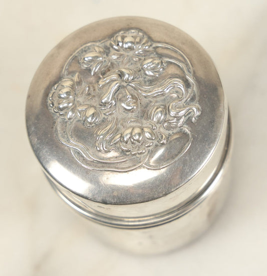 × CLOSESold outLot 027 - Antique Art Nouveau Sterling Silver Powder Box With Woman Face Motif, Axe With Three x Hallmark, Attributed To Wm.B. Kerr & Co - Newark, NJ - Approx 1.55 Ounces Troy