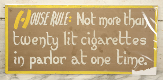 × CLOSESold outLot 031 - Vintage Hand Painted Pool Hall Sign On Press Board, "House Rule: Not More Than 20 Lit Cigarettes," Note Corner Losses, Wear, Wrapped With Backing Board, 24-1/4" x 11-1/4"