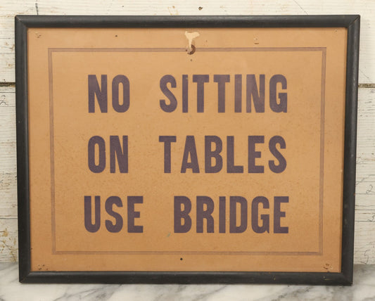 × CLOSESold outLot 033 - Vintage Printed Pool Hall Sign On Press Board, "No Sitting On Tables, Use Bridge," Note Wear, In Frame, 14-7/8" x 11-3/8"
