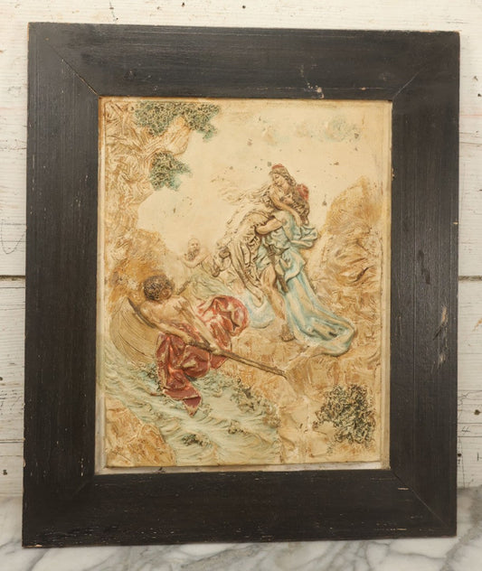 × CLOSESold outLot 044 - Antique Relief Plaque In Frame Depicting A Man And A Woman In And Embrace, Bearded Man Watching, Boy In Canoe, Unknown Scene, Possible Mythology Reference, 15-1/4" x 18"