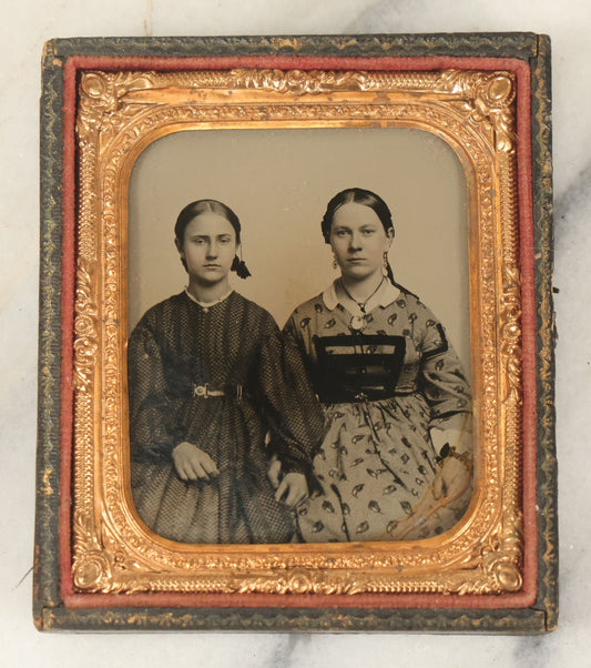 × CLOSESold outLot 053 - Antique 1/6th Plate Ambrotype Photograph Of Two Young Women, Likely Sisters, With Linked Hands, Note Wear In Lower Right Corner, In Half Leatherette Case