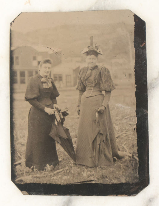Sold For: Login to See Price Confirm BidLot 059 - Single Antique Tintype Photograph, Two Women Outdoors In Town Square, With Parasols