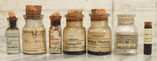 × CLOSESold outLot 075 - Grouping Of 7 Antique Glass Bottles For Artists Supplies, Including Tinting Oil, Oil Anise, Lustre, And Others, As Found, Various Manufacturers