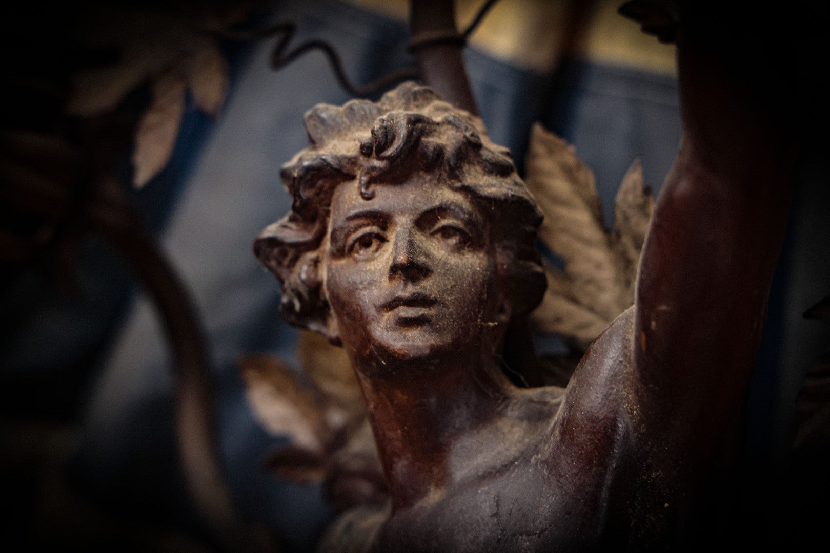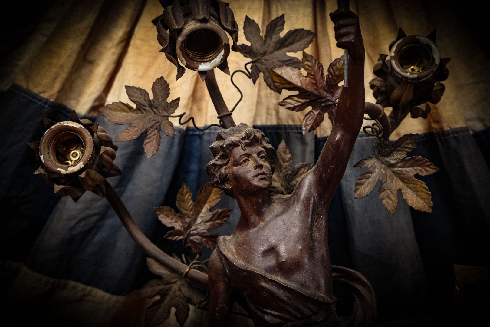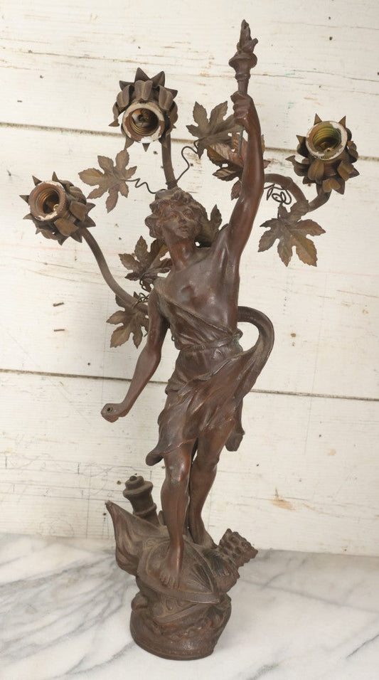 Lot 001 - Antique French Bronzed Spelter Art Nouveau Neo-Classical Revival Figural Lamp Base With Male Figure With Outstretched Arm Holding Torch And Three Curved Lighting Arms With Metal Leaves, Note Lamp Needs Complete Rewiring And Has Metal Damage