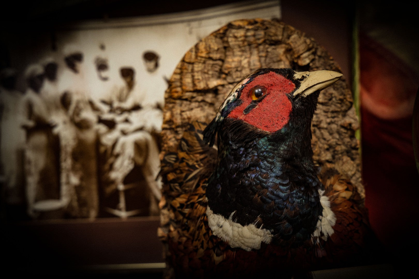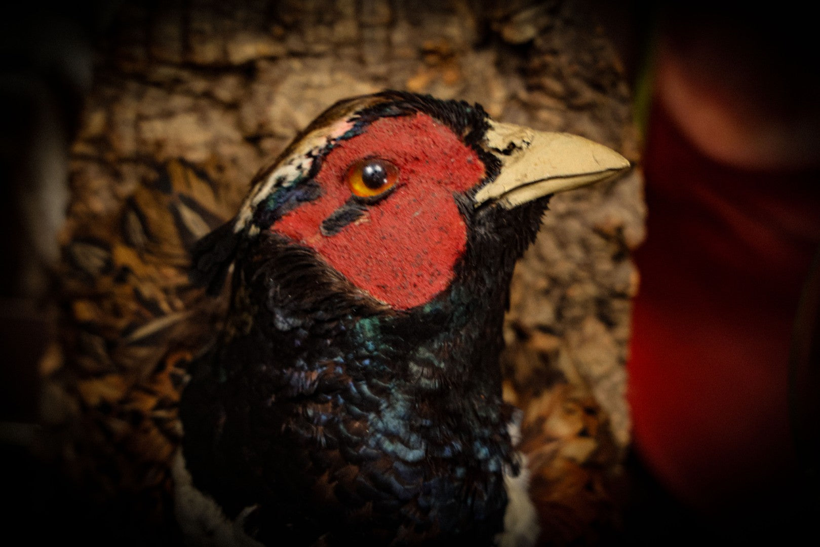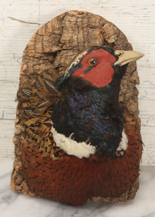 Lot 005 - Vintage Taxidermy Ring-Necked Pheasant Head Mount On Faux Bark Cork Plaque With Wire Hanger
