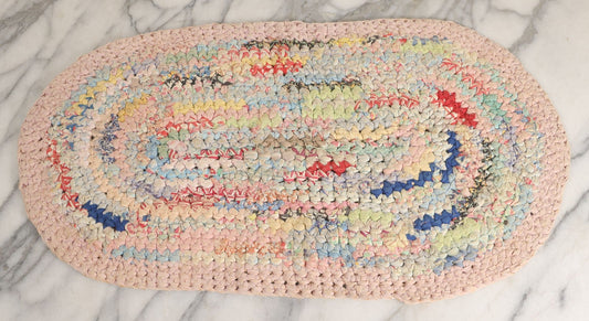 Lot 032 - Vintage Handmade Hooked Oval Rug With Many Bright Colors Including Pink, Red, Green, And Blue, 23" x 12-3/4"