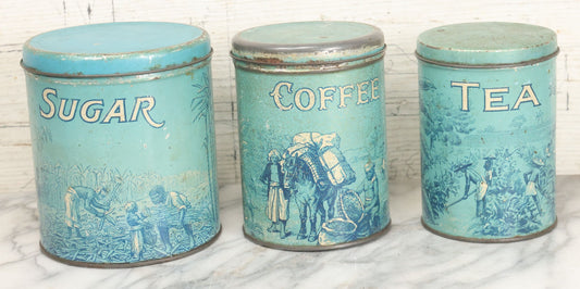 Lot 040 - Three Piece Vintage Tin Lithograph Graduated Nesting Kitchen Canister Set Including Tea, Coffee, And Sugar With Blue Color And Scenes Of Agricultural Workers