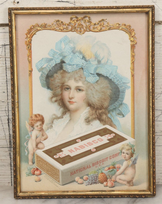 Lot 053 - Antique Nabisco National Biscuit Company Lithographed Advertisement With Woman In Blue Hat And Cherubs, Copyright 1902, In Vintage Frame, 7-1/8" x 9-1/2"