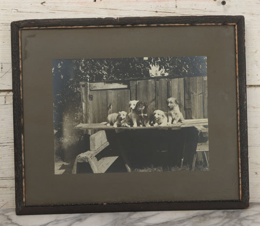 Lot 064 - Antique Boarded Photograph Of Five Happy Puppies Sitting On Lumber In Front Of Fence, In Frame, 16-1/2" x 13-5/8"