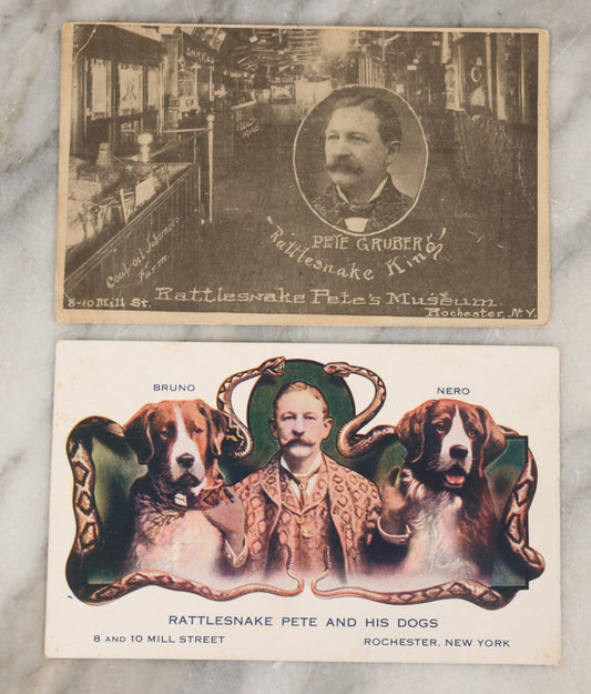 Lot 080 - Pair Of Antique Sideshow Souvenir Postcards Advertising Rattlesnake Pete's Museum, Rochester, New York, Including "Rattlesnake Pete And His Dogs" And Pete Gruber "Rattlesnake King"