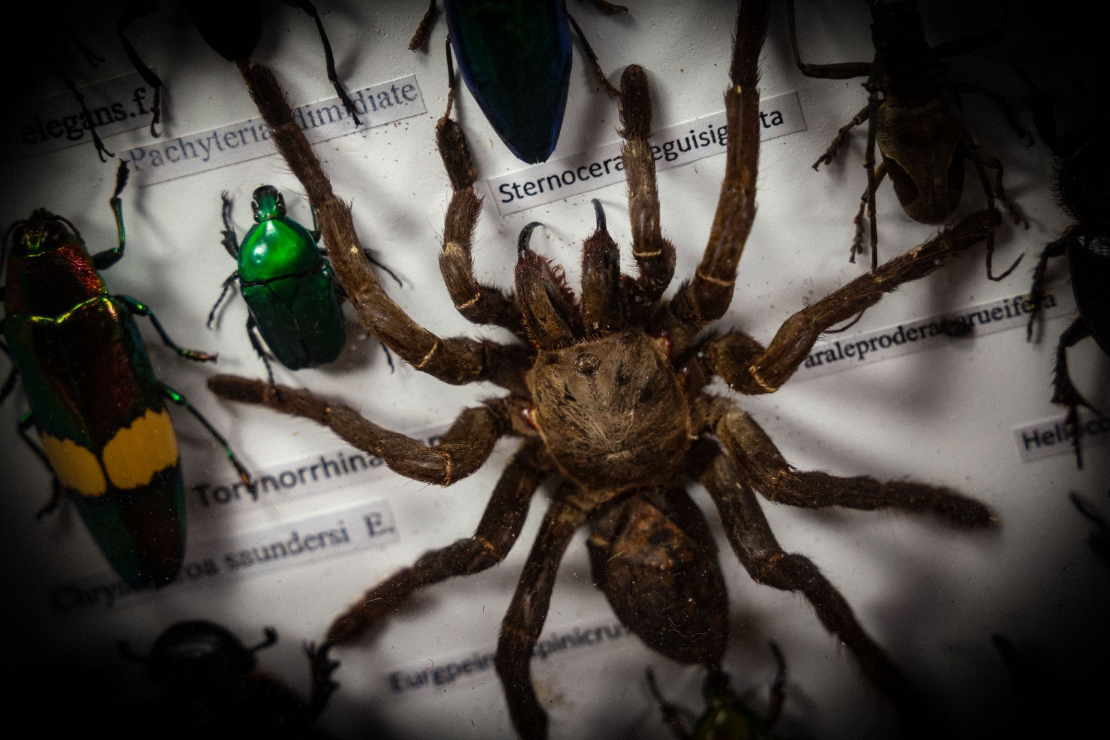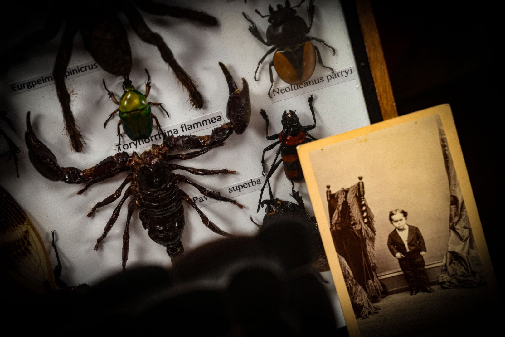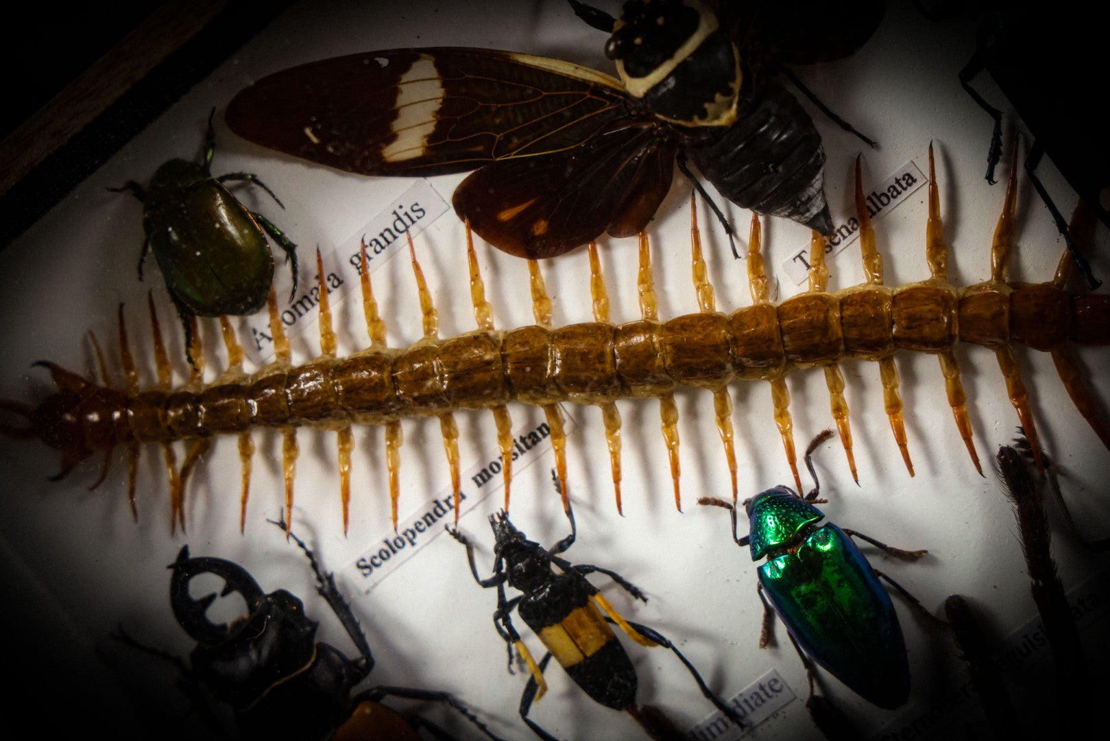 Lot 004 - Modern Shadow Box Taxidermy Insect And Bug Display With 19 Specimens Including Scorpion, Tarantula, Centipede, Moths, And Beetles, 7-7/8" x 14"