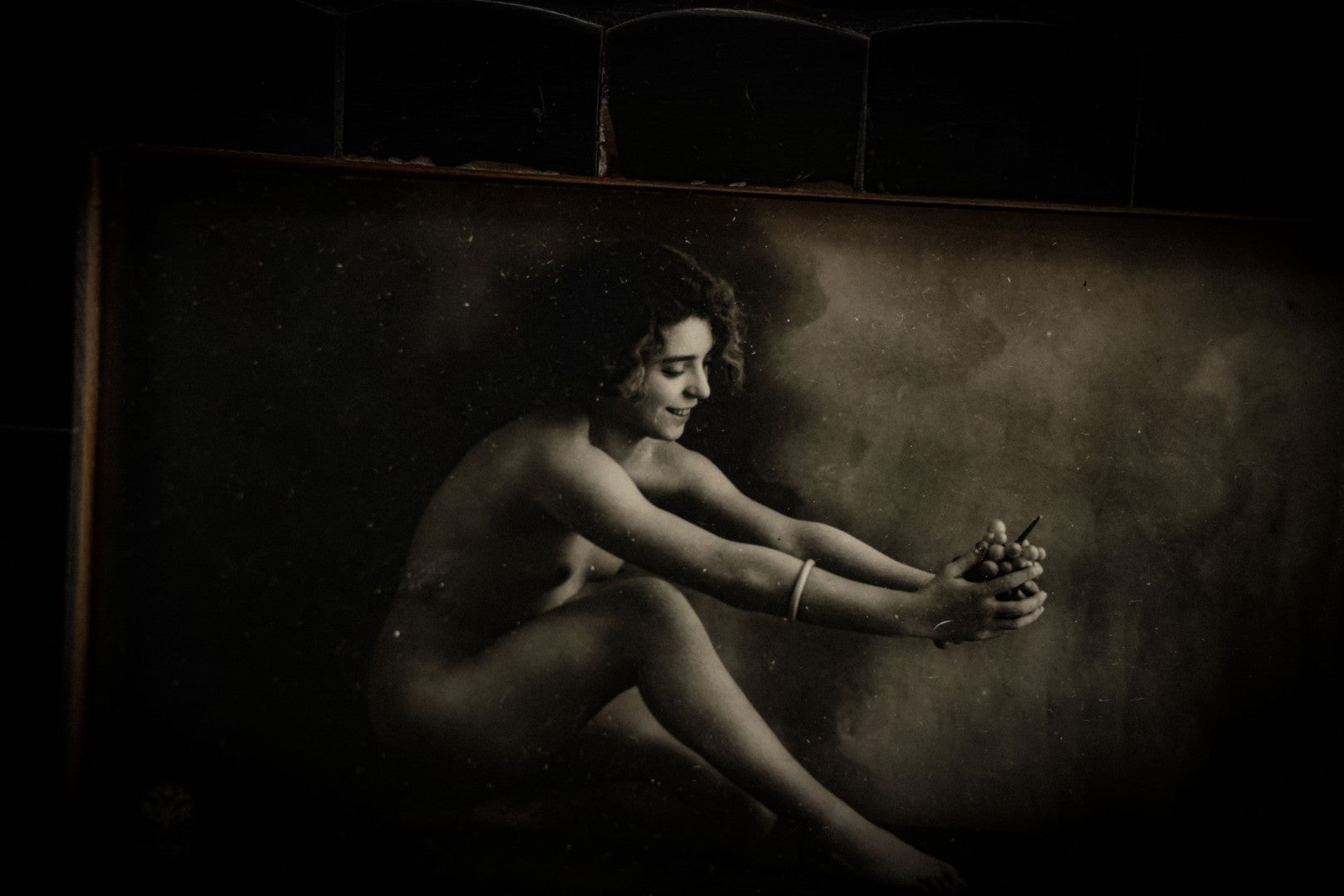 Lot 047 - Pair Of Antique French Nude Postcards Of Women Looking Fondly At Bundle Of Grapes, In Two Poses, Published By Armand Noyer, Series No. 4391, Made In France, In Matching Vintage Frames, 8" x 6" each
