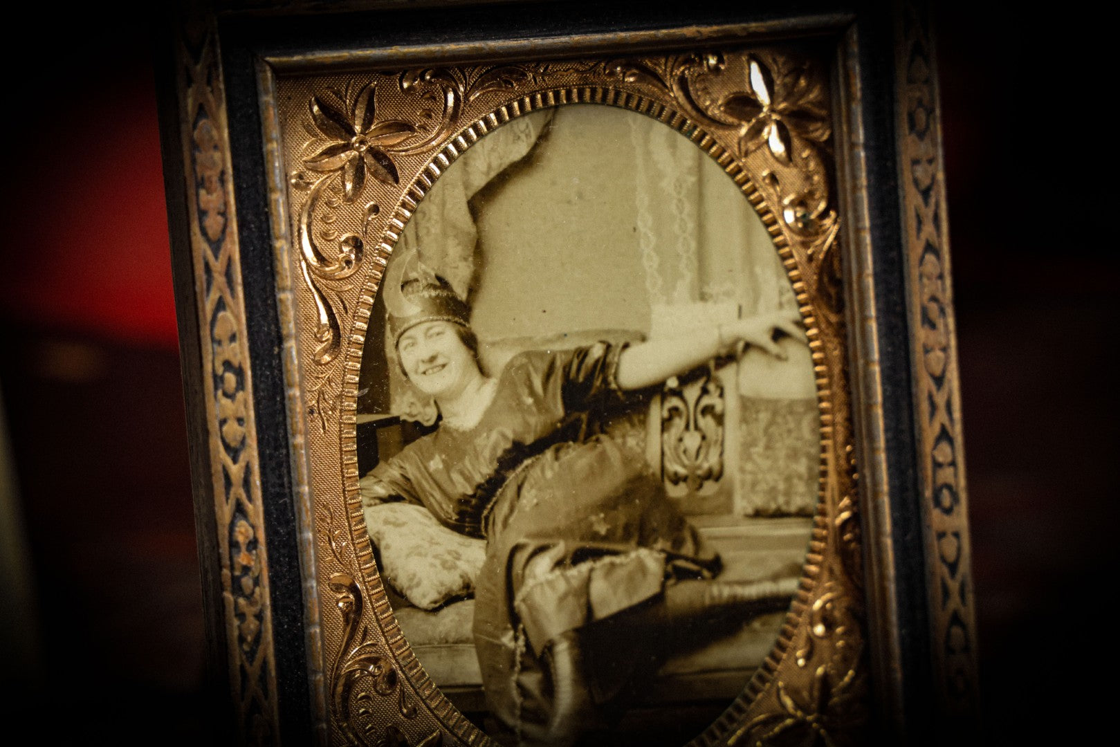 Lot 058 - Antique Trimmed Real Photo Postcard R.P.P.C. Of Woman In Crescent Moon And Star Decorated Costume, Frame With Brass Mat, 4" x 5"