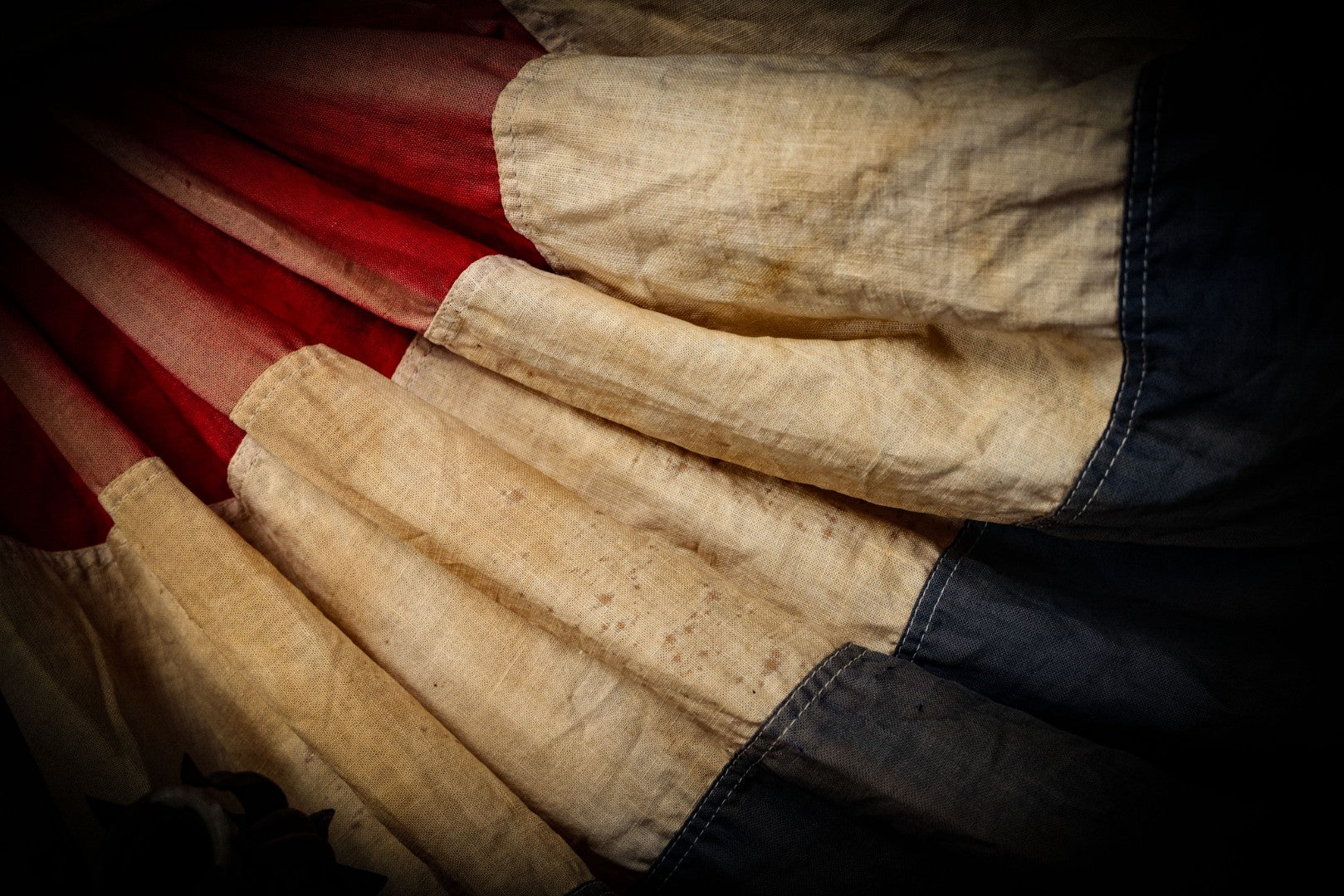 Lot 007 - Vintage Red White And Blue Patriotic Bunting, Note Holes, Fading, And Staining, 76" W x 34" H