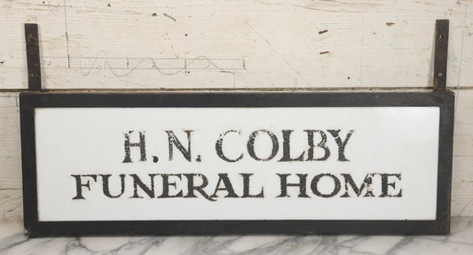 Lot 001 - Vintage Hand Painted Sign For "H.N. Colby Funeral Home" Lawrence, Massachusetts, In Metal Frame With Brackets, Painted On Vitrolite "Better Than Marble Composite Material," Circa 1940s, 25-5/8" L x 8-1/2" H