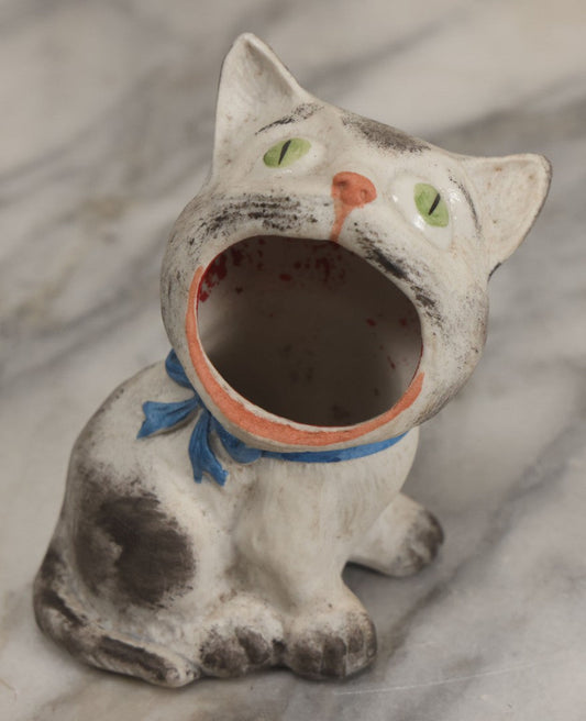 Sold For: Login to See Price Confirm BidLot 009 - Vintage Bisque Painted Cat Ashtray With Blue Bow And Green Eyes, Made In Germany, 4&q[...]