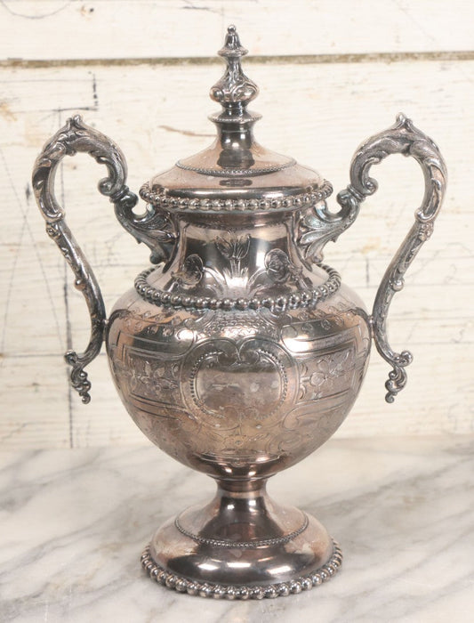 Lot 014 - Vintage Ornate Silverplate Urn With Decorative Handles, Floral Design, Lid, Manufactured By Meriden Britannia Company, No. 1835, 10" Height