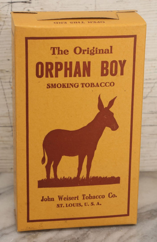 Lot 022 - Vintage Unused Advertising Box For One Dozen Five Cent Size "The Original Orphan Boy Smoking Tobacco" Packs For Pipe Or Cigarette, With Donkey Graphic, John Weisert Tobacco Co., St. Louis, Missouri