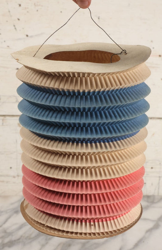 Lot 034 - Vintage Red White And Blue Patriotic July 4th Accordian Style Concertina Paper Lantern With Wire Hanger And Candle Mount