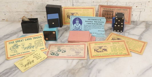 Lot 037 - Vintage Magician's Grouping With Several Foldered Card Tricks, Nesting Dice Tricks, String Of Cards Trick, Dummy Card Deck, And Other Misc. Pieces