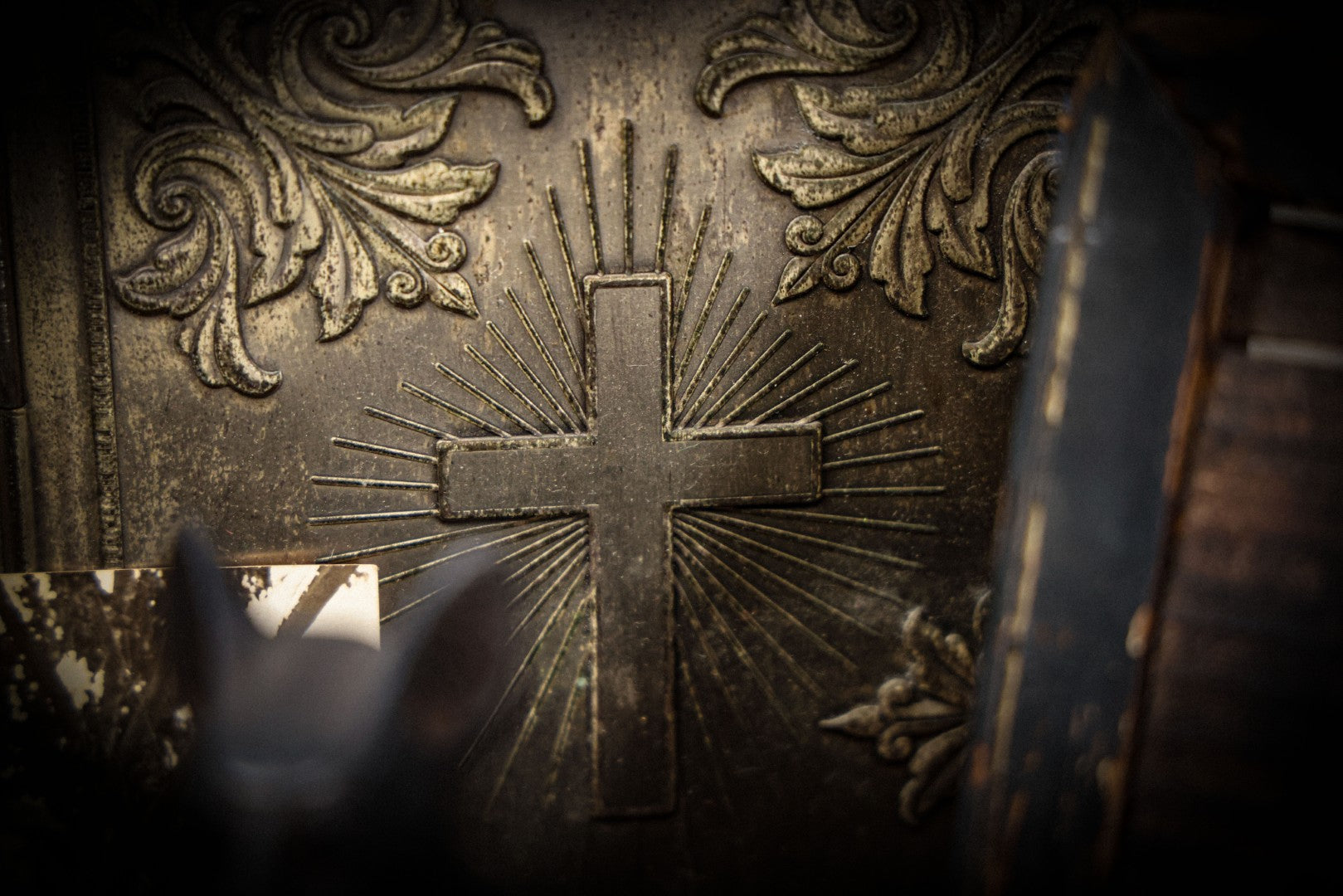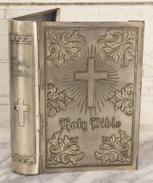 Lot 040 - Vintage Pressed Silvertone Metal Holy Bible Hinged Book Cover With Cross And Decorative Embellishments