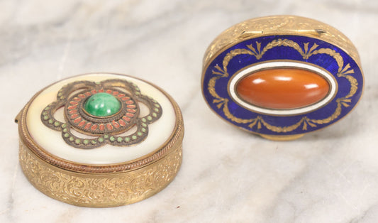 Lot 045 - Pair Of Vintage French Brass Pill Boxes With Decorative Covers Featuring Enamel And Stone Embellishments, With Interior Beveled Mirrors