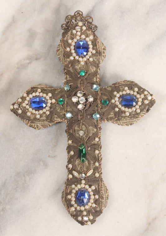 Lot 046 - Vintage Decorative Textile Cross With Blue Green And White Glass Gem Embellishments