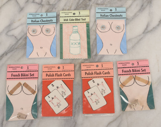 Lot 047 - Grouping Of Seven Vintage "International Gags" Offensive Stereotype Novelty Jokes, Including Italian Chestnuts, French Bikini Set, And Polish Flashcards, Wade Enterprises, East Granby, Connecticut