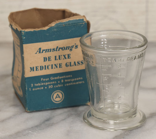 Lot 049 - Vintage Armstrong's De Luxe Medicine Glass One Ounce Dosage Measuring Cup In Box, Drug Sundries Department, Armstrong Cork Co., Lancaster, Pennsylvania