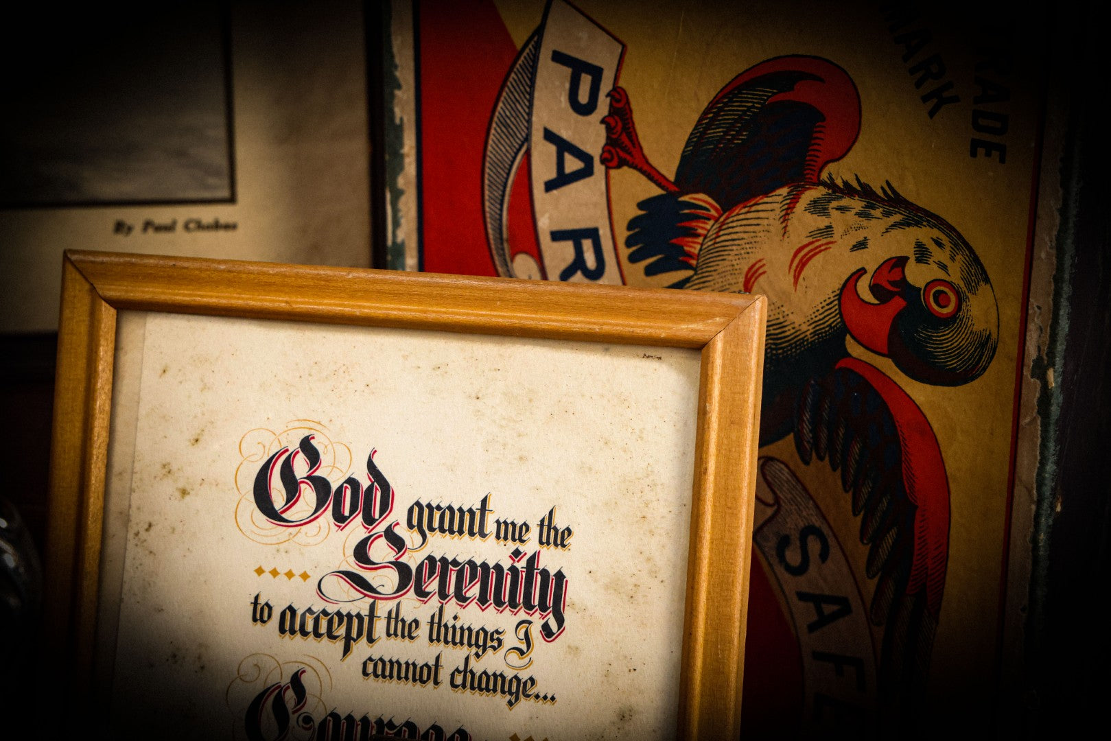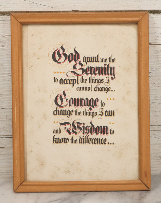 Lot 062 - Vintage Serenity Prayer Motivational Wall Art, "God Grant Me The Serenity To Accept The Things I Cannot Change..." Attributed To Reinhold Niebuhr, Associated With Alcoholics Anonymous Prayer, In Frame, 6-3/4" W x 8-3/4" H