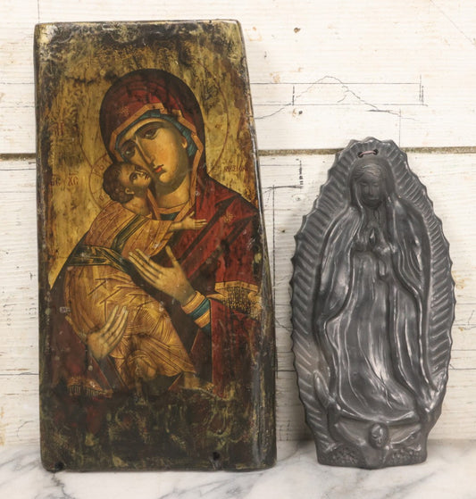 Lot 069 - Pair Of Vintage Virgin Mary Christian Devotional Decor Wall Hangers Including Decoupage Wooden Plaque, And Black Ceramic Plaque