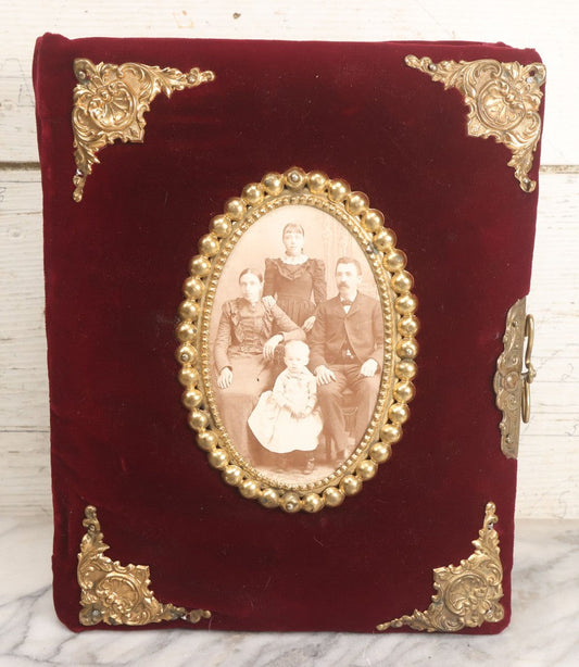 Sold For: Login to See Price Confirm BidLot 071 - Antique Victorian Family Photo Album With Replaced Red Velvet Cover With Family Portr[...]