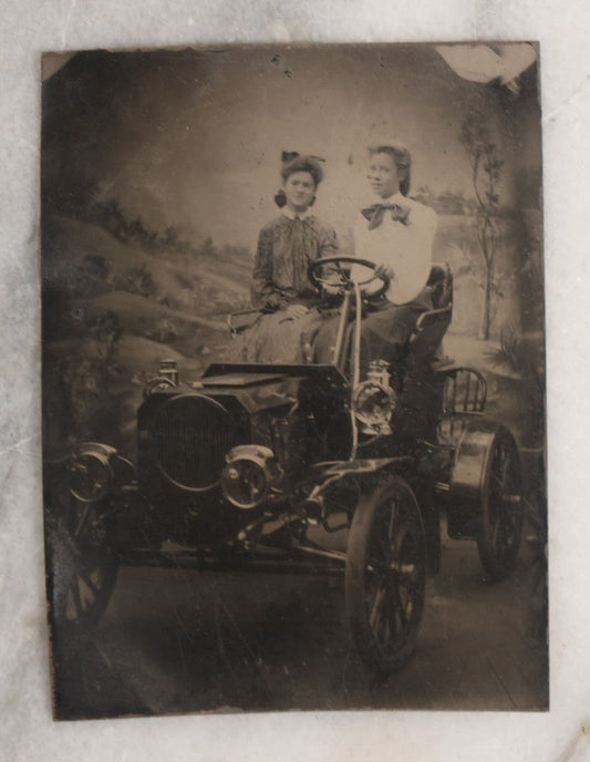 Lot 075 - Single Antique Tintype Photograph Of Two Ladies Posing In An Early Automobile In Studio With Landscape Backdrop