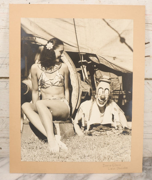 Lot 079 - Vintage Boarded Photograph Of Costume Designer Doris Clare Posing With Circus Clown Lou Jacobs, Both In Costume, In Front Of Circus Wagon