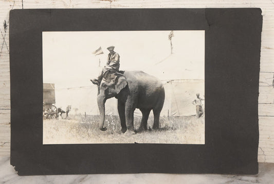 Lot 080 - Vintage Snapshot Photo Album Page With A Photo Of Circus Worker Seated Atop An Elephant's Head, Other Photos On Verso