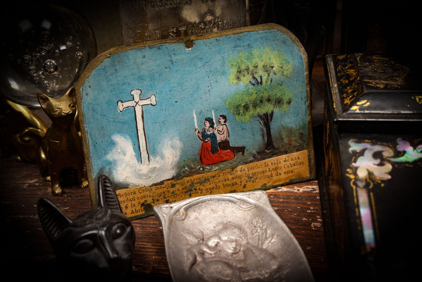 Lot 052 - Vintage Mexican Ex-Voto Retablo Devotional Folk Art Painting On Tin Commemorating The Intercession Of The Holy Spirit In Curing A Sick Woman After Calling Upon The Holy Cross, Allende, Mexico, April 1903, 6-1/2" W x 4-5/8" H