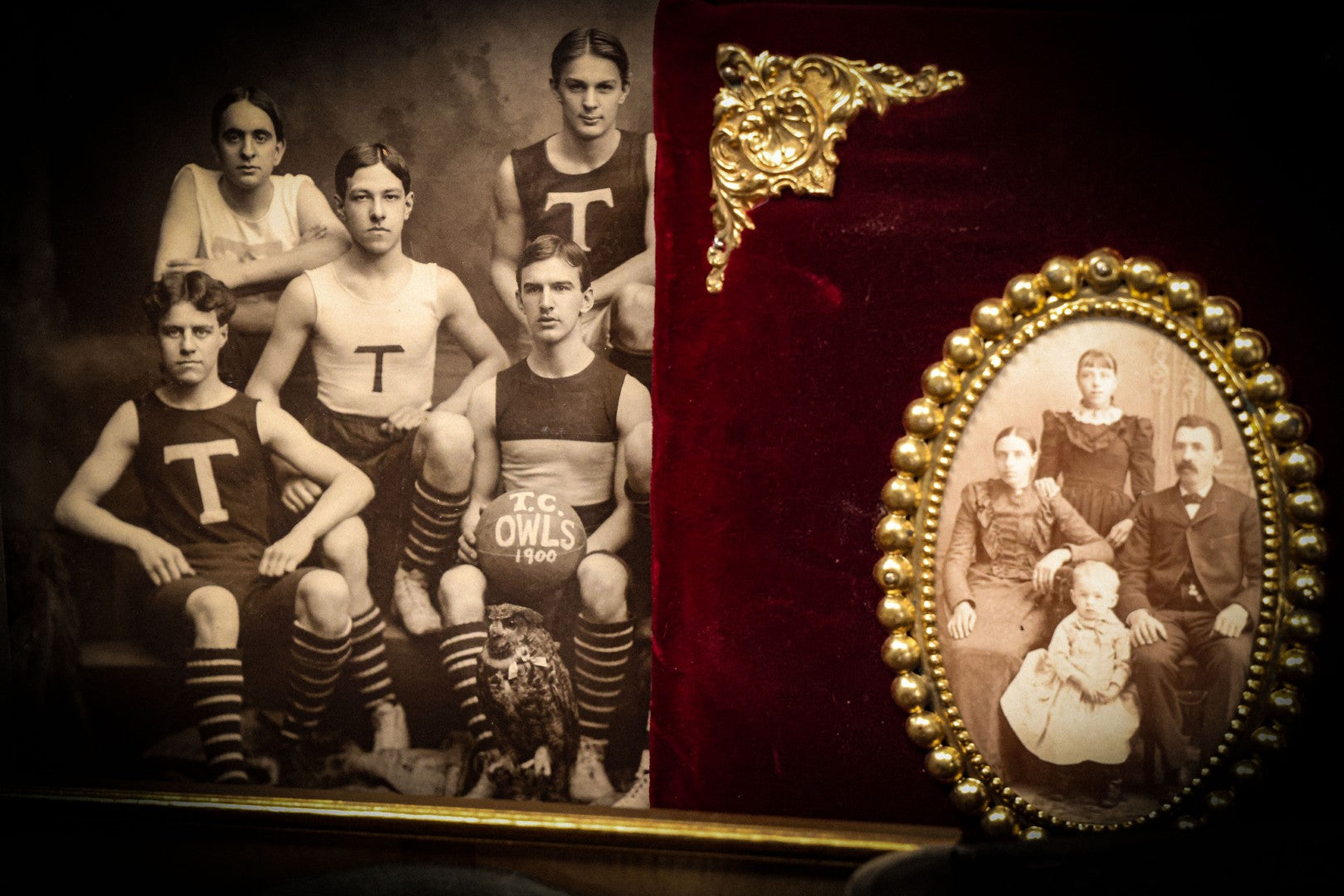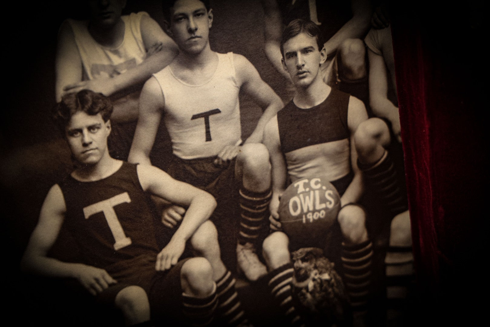 Lot 078 - Antique Boarded Photograph Of High School Basketball Team, The T.C. Owls, Posing With Owl Mascot, In Handmade Jerseys, 1900, F. Gutekunst, Photographer, Philadelphia, Pennsylvania