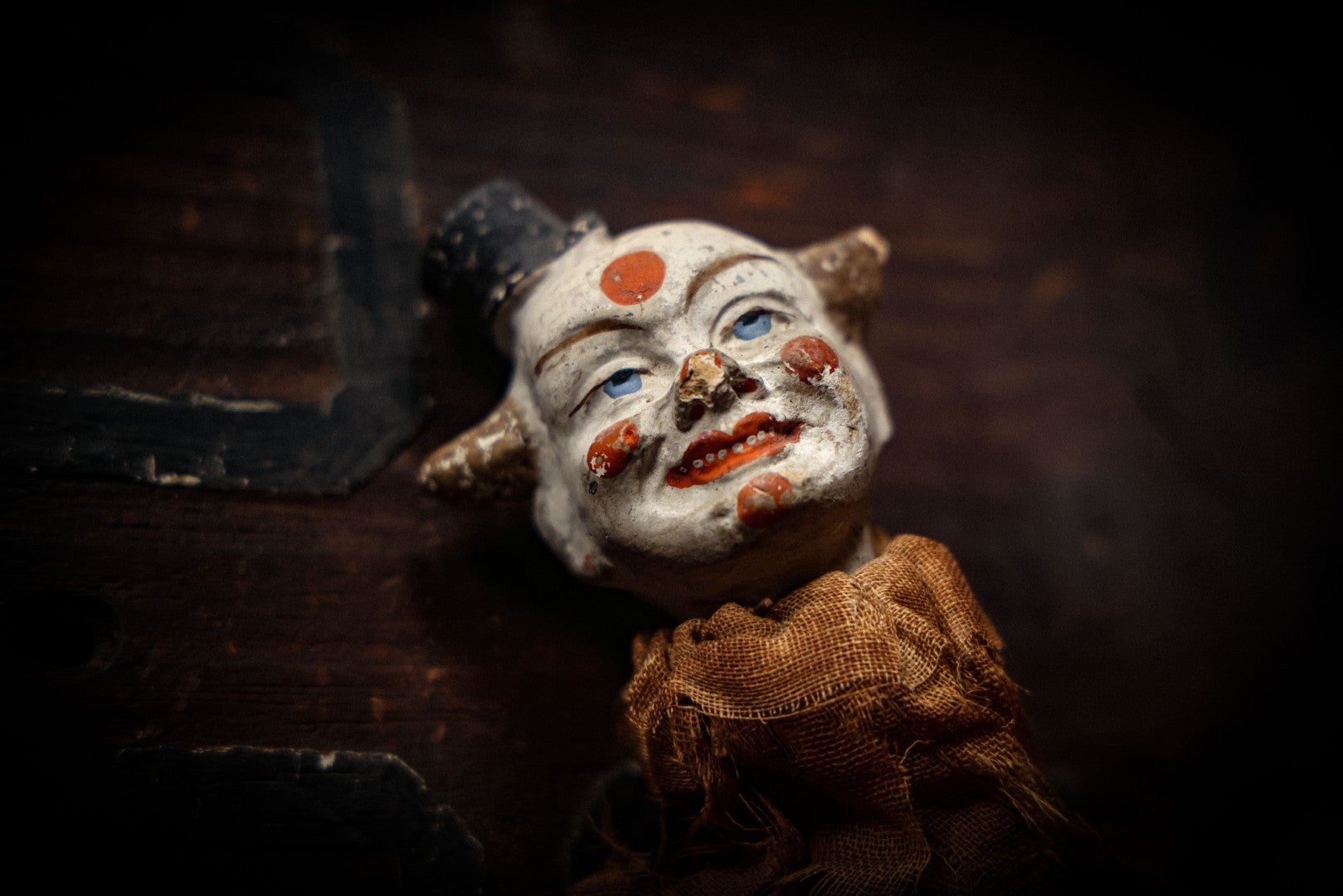 Sold For: Login to See Price Confirm BidLot 005 - Antique Animated Clown Doll With Composition Head, Remnants Of Clothes And Finger Ope[...]