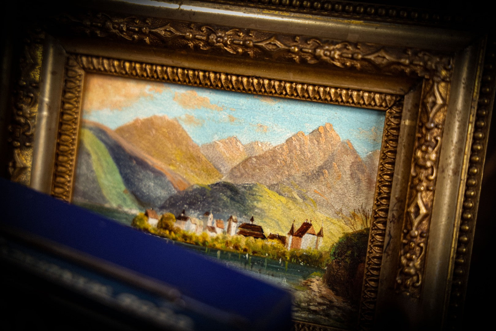 Lot 054 - Antique Miniature Painting On Board Of European Lakeside Mountain Town In Ornate Gilded Frame, 6-5/8" W x 5-1/2" H