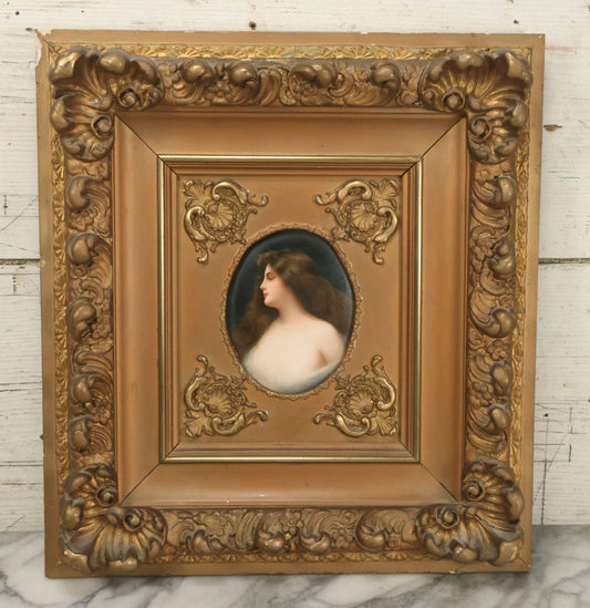 Lot 001 - Fine Antique Hand Painted Porcelain Tile Of Semi-Nude Woman In Ornate Gesso Frame, Marked "Erblüht" ("Blossom") On Verso, After Angelo Asti, Artist Signed Wagner, With Hallmark, 14" x 15-1/2"